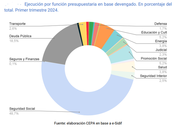 El CEPA dice que “se observa una gran incidencia de la Seguridad Social sobre el total, ya que insumió casi el 49% del total del gasto”. “Sin embargo, también es significativa la incidencia de los Servicios de Deuda Pública, que ocuparon 18,5% del gasto total. Luego se ubican otras funciones con incidencias menores, como Energía con el 3,8%, Educación y Cultura junto Promoción Social, ambos con el 5,2%, Salud con el 3,8%; y el resto de las aperturas con una incidencia menor al 3% de la ejecución total”, indica el relevamiento.