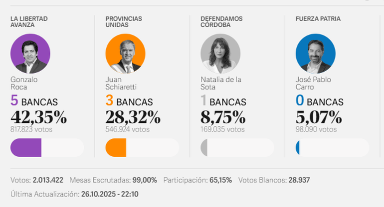 Con estos resultados, el partido del Presidente Javier Milei tendrá cinco diputados más por Córdoba, Alianza Provincias Unidas tres diputados y Defendamos Córdoba uno.