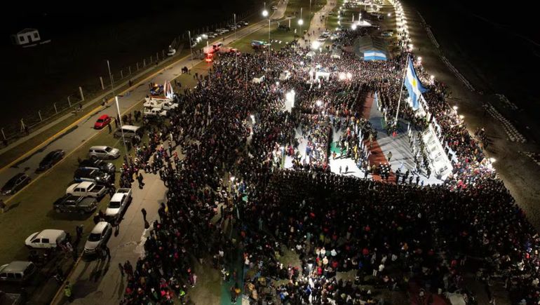 Miles de vecinos participan de esta tradicional ceremonia a orillas del Mar Argentino. El homenaje se lleva adelante frente al Monumento a los Héroes de Malvinas.