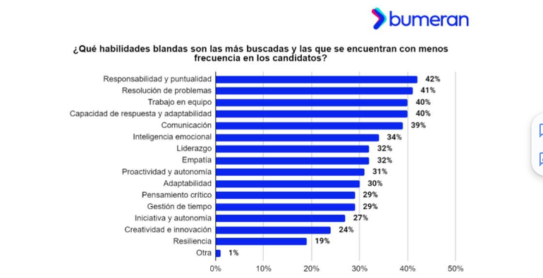 Según un estudio del portal de empleo Bumeran, el 42% de los especialistas en recursos humanos destaca que la responsabilidad y puntualidad son las habilidades blandas o competencias sociales más buscadas, y que se encuentran con menos frecuencia en los talentos.