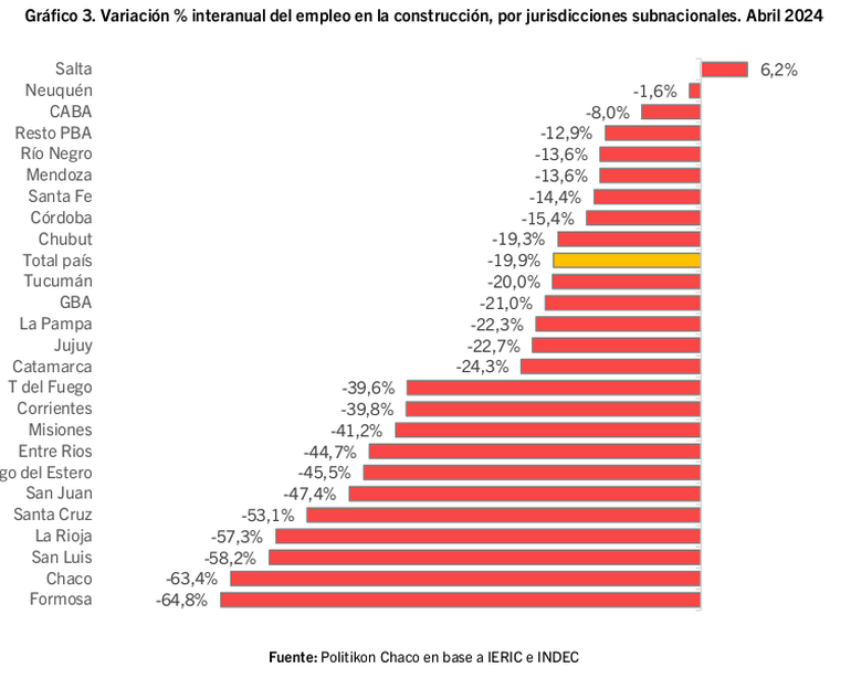 En este marco, los descensos más fuertes estuvieron en Chaco (-63,4%) y Formosa (-64,8%). La posición de estas dos provincias como las de mayores caídas relativas interanuales se repite por séptimo mes consecutivo.