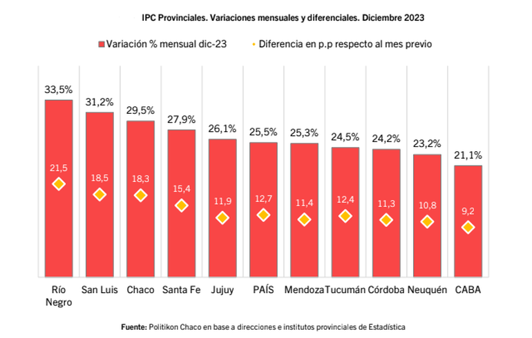 En ese contexto, cinco distritos registraron alzas del IPC superiores al total país relevado por el INDEC en diciembre con Río Negro a la cabeza (33,5%), seguida por San Luis (31,2%) y Chaco (29,5%). Por el contrario, en CABA se vio el incremento más leve del mes (21,1%).