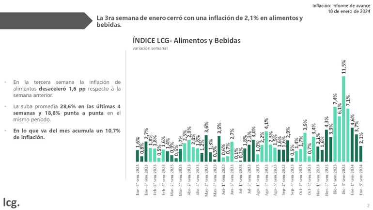 De acuerdo con LCG, la inflación de alimentos de la tercera semana de enero descendió al 28,6%, lo que resulta inferior al 30,8% de la primera y al 32,2% de la segunda. Para tener en claro cómo se hace este tipo de relevamiento, se trata del promedio de las últimas cuatro semanas.
