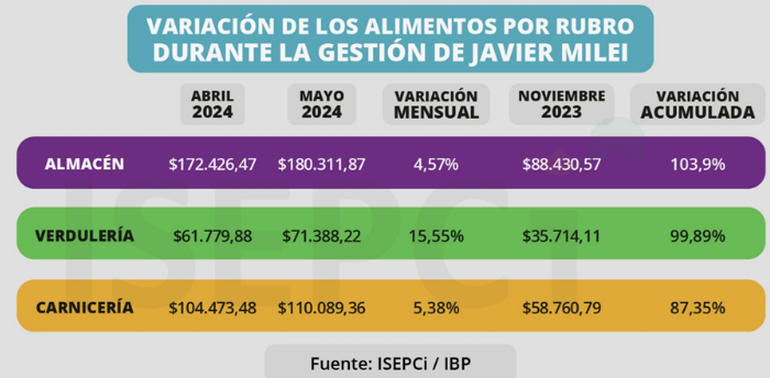 "Sin embargo, en los últimos seis meses éstos últimos lideran los incrementos con 103,90%, seguidos por frutas y verduras con 99,89% y al final quedaron las carnes con una suba de 87,35% en el mismo período", indica el resporte.