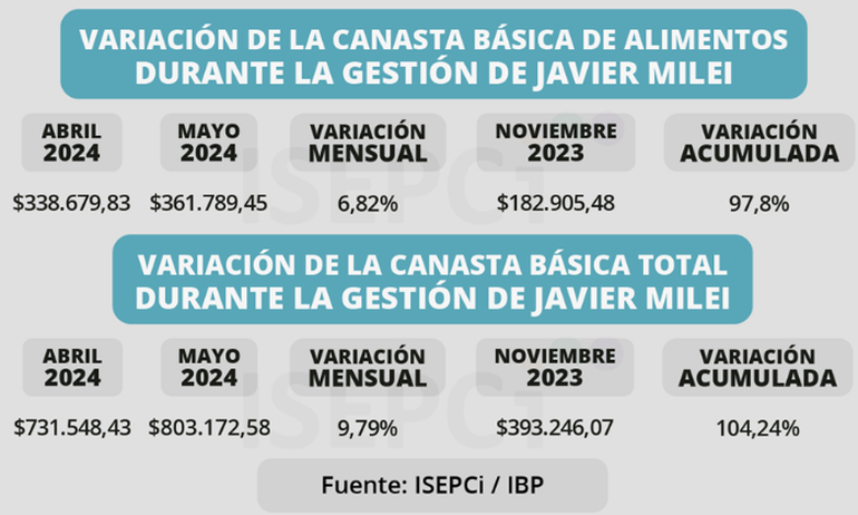 Por su parte la CBT que para la misma familia en abril fue de $731.548, en mayo ascendió a $803.172, o sea +9,79% y +104,24% respecto a noviembre 2023.