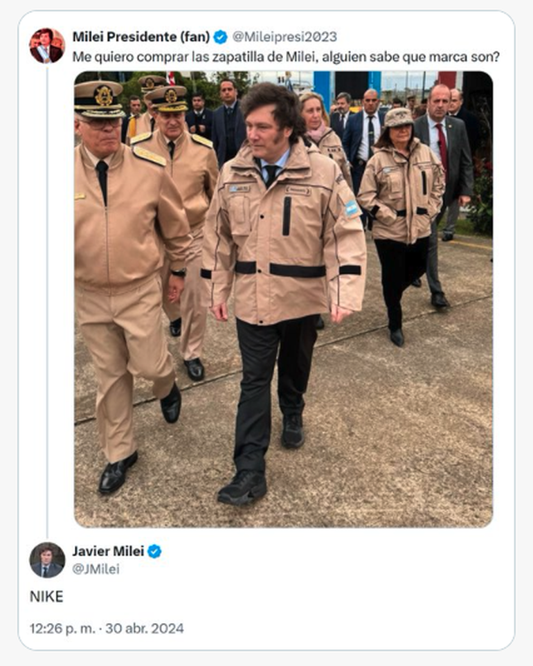 Durante el acto, en una de las imágenes, se ve a Milei con una llamativas zapatillas negras, que llamaron la atención de los usuarios de la red social y le consultaron sobre la marca. El presidente respondió y reveló que se trata de un calzado de la marca Nike.