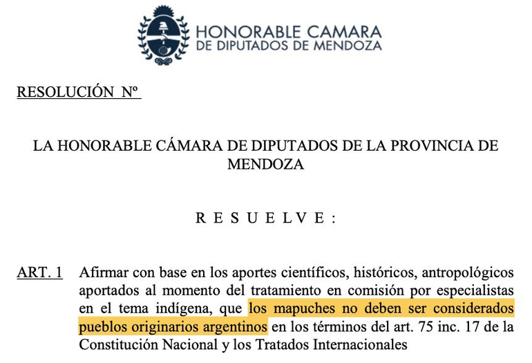 "Con base en los aportes científicos, históricos, antropológicos aportados al momento del tratamiento en comisión por especialistas en el tema indígena, que los mapuches no deben ser considerados pueblos originarios argentinos en los términos del art. 75 inc. 17 de la Constitución Nacional y los Tratados Internacionales", asegura la resolución presentada por el titular del Bloque de Diputados del PRO en Mendoza, Gustavo Cairo.