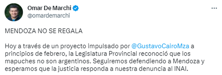Por su parte, el diputado nacional por Mendoza, Omar de Marchi celebró en sus redes sociales la aprobación del proyecto al afirmar que "Mendoza no se negocia" y señaló: "Hoy a través de un proyecto impulsado por Gustavo Cairo a principios de febrero, la Legislatura Provincial reconoció que los mapuches no son argentinos. Seguiremos defendiendo a Mendoza y esperamos que la justicia responda a nuestra denuncia al INAI".