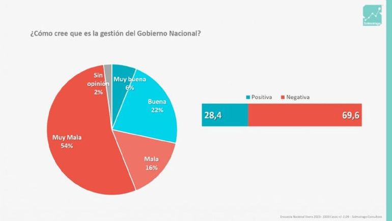 Otra de las preguntas fue sobre la gestión del gobierno de Alberto Fernández. Más de la mitad, el 54%, piensa que la gestión es "muy mala", y sólo un 22% cree que el gobierno es "bueno". Las otras opciones, "malo" y "muy bueno", se ubicaron con el 16% y 6% respectivamente.