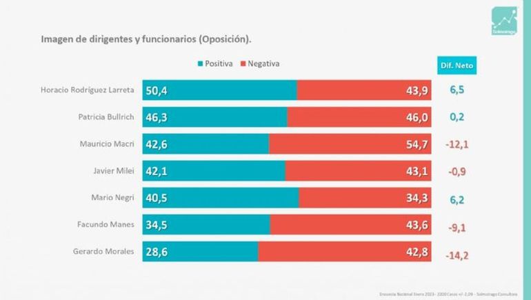 Por parte de la oposición, Rodríguez Larreta está primero con un 50,4% de imagen positiva y un 43,9% de negativa. Por su parte, Patricia Bullrich se posiciona segunda con un 46,3% de imagen positiva y un 46% de negativa. El expresidente Mauricio Macri se afirma en el tercer lugar con un 42,6% de positividad y un 54,7% de negatividad.