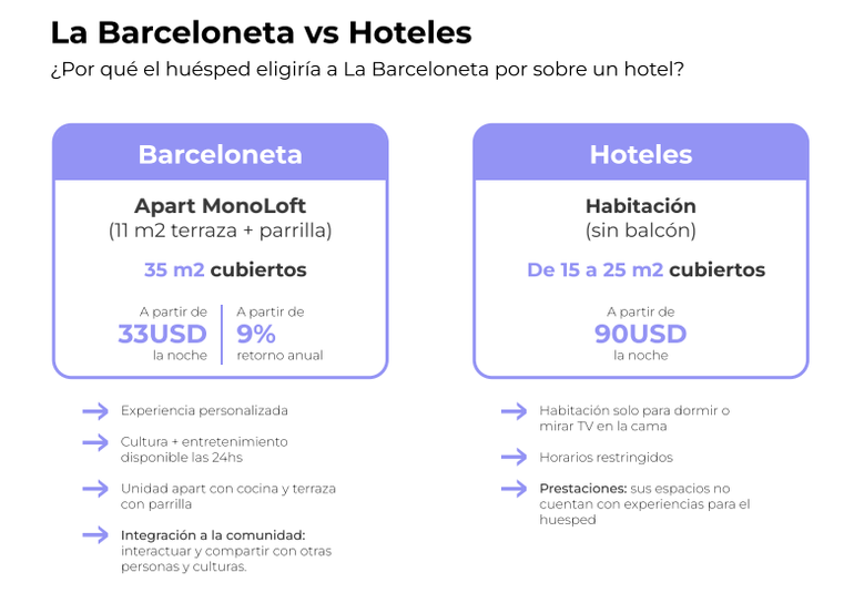 La Barceloneta te propone entre sus opciones, Apart MonoLoft de 46 m2 totales, con 11 m2 de terraza propia con parrilla y 35 m2 cubiertos, pudiendo comer un asadito en tu propio departamento. ¿Qué valor le pondrías a esto? Sólo USD 33 la noche, equiparable a USD 16,5 por persona. Tomando como ejemplo esta experiencia, se puede decir que con sólo 22 días de ocupación un inversor generaría un 9% anual en dólares sobre lo invertido.