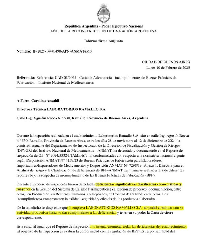 Este informe que reveló La Nación detalla que entre el 28 de noviembre y el 12 de diciembre de 2024, inspectores del Instituto Nacional de Medicamentos (Iname) detectaron "deficiencias significativas clasificadas como críticas y mayores" en todas las áreas clave de la planta ubicada en Ramallo, provincia de Buenos Aires. Las fallas comprometían directamente "la calidad, seguridad y eficacia de los productos elaborados".