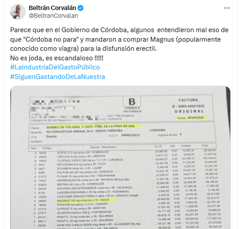 Beltrán Corvalán, vocal del Tribunal de Cuentas de Córdoba, realizó en las últimas horas uan fuerte denuncia con una publicación en su cuenta de X, en la que mostró una factura del Servicio Penitenciario en la que figuraba la compra de Sildenafil, más conocido como Viagra.
