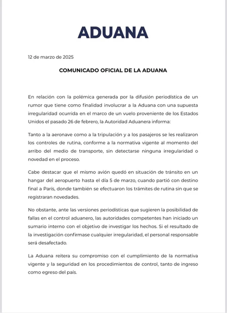 El comunicado de la Aduana negó este miércoles cualquier irregularidad en el control de un avión proveniente de los Estados Unidos, pero confirmó que inició una investigación interna tras la denuncia periodística de Carlos Pagni en La Nación+.