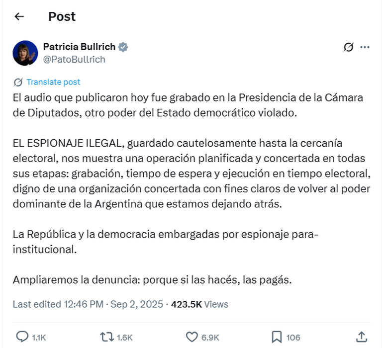 Casi en simultáneo a las publicaciones de Menem y Milei, la ministra de Seguridad Patricia Bullrich respaldó la postura presidencial y adelantó que ampliará la denuncia judicial por presunto espionaje ilegal que presentó el martes.