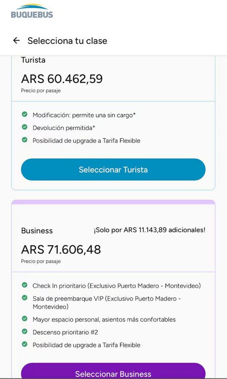 En el caso de Buquebus, el boleto de ida y vuelta en clase turista cuesta desde ARS $60.462,59, mientras que una opción en clase business o con mayor flexibilidad asciende a ARS $71.606,48. La elección depende de si se prioriza la economía o la comodidad durante la hora de travesía.