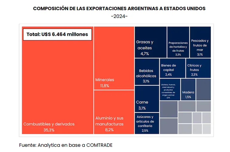 Según datos de la consultora Analytica, Argentina mantiene históricamente un déficit comercial con Estados Unidos, que promedió USD 3.666 millones anuales entre 2014 y 2023. Sin embargo, en 2024, por primera vez desde 2005, el balance fue superavitario, con un resultado positivo de USD 228 millones. Las exportaciones argentinas al mercado estadounidense alcanzaron USD 6.464 millones ese año.