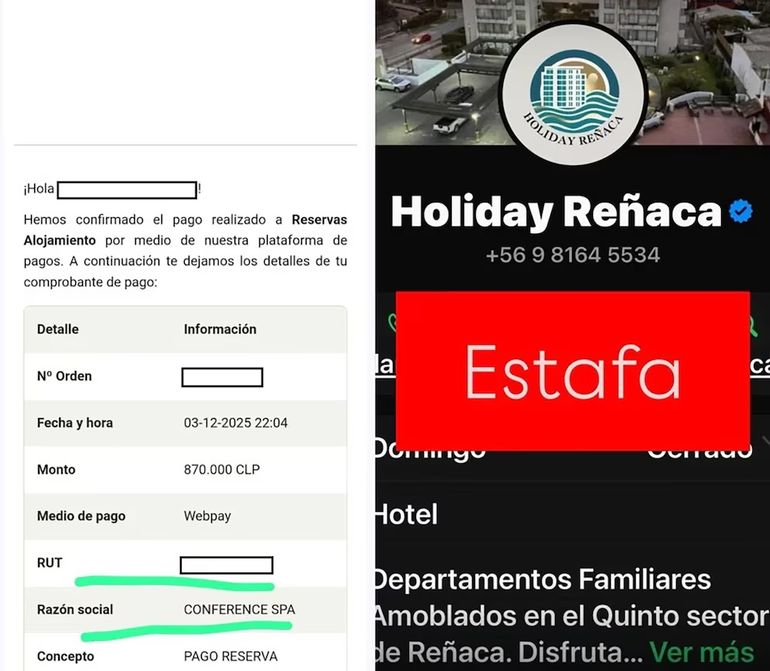 Alrededor de 200 turistas argentinos se vieron afectados por una estafa al alquilar departamentos en un apart hotel ubicado en el concurrido balneario de Reñaca, en Viña del Mar. Algunos adelantaron más de $1 millón (USD 1.100, de acuerdo a la cotización chilena). El responsable apareció, cerró el sitio web falso, pidió perdón con una cita bíblica y desapareció.