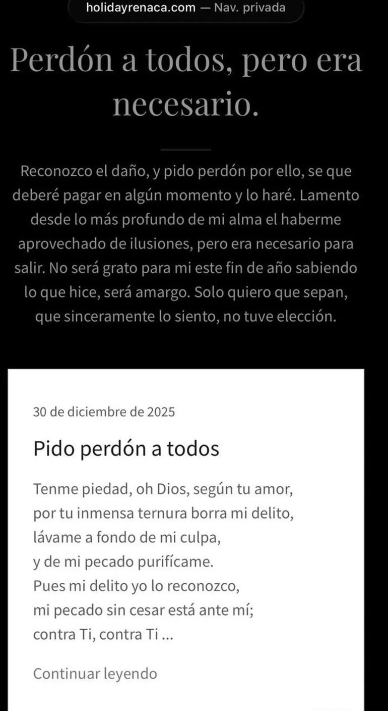 En un giro insólito, desde la plataforma donde operaba el supuesto "Holiday Reñaca" también se publicó un mensaje de disculpas, en el que reconoce el daño causado y asegura que "deberá pagar en algún momento". Sin embargo, no hay rastros de los fondos ni de una responsabilidad legal clara por el momento.