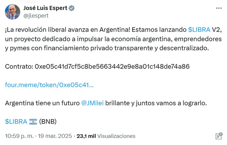 Desde la cuenta del legislador se publicó un mensaje promocionando el activo digital casi idéntico al que difundió Javier Milei el 14 de febrero pasado. “¡La revolución liberal avanza en Argentina! Estamos lanzando $LIBRA V2, un proyecto dedicado a impulsar la economía argentina, apoyando emprendedores y pymes con financiamiento privado transparente y descentralizado”, decía la publicación.