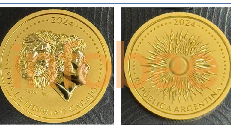 De un lado, el rostro de Milei de perfil y con el mentón en alto, y su cabello entrelazado con la melena de un león que completa el corazón de la moneda. Alrededor, el lema “¡Viva la libertad carajo!” y, en el reverso, un sol radiante.