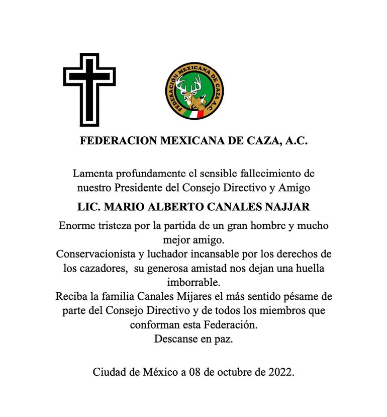 “Mi más sentido pésame a la familia de Mario Canales, quien fue asesinado hace dos días por un búfalo en Argentina. Yo y todos los que conocimos a este hombre de Conservación, este hombre de honor, presidente de la Federación Mexicana de Caza, lloramos junto a su familia. Dicen que los cazadores nunca mueren... Simplemente van más profundo en el bosque”, publicó en sus redes sociales.