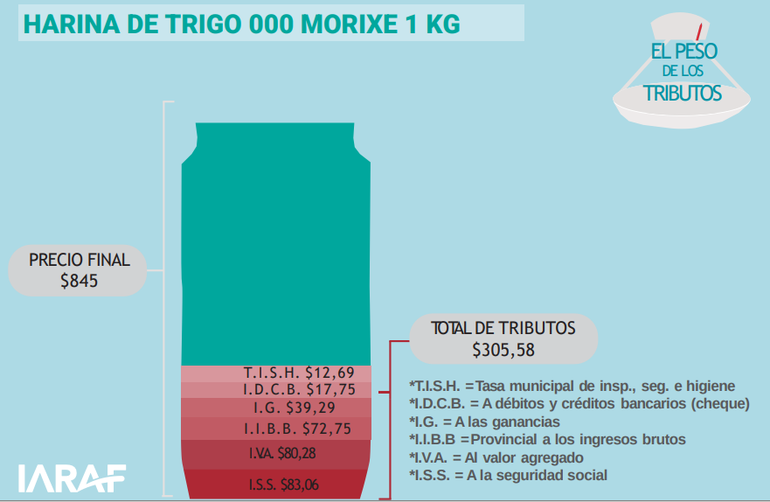 Un ejemplo que ofrece el reporte es el de la harina 000 Morixe, que para un precio de $845 paga como impuesto $305. para $83.06 de Seguridad Social; $80.28 de IVA; 72,75 de ingresos brutos; $39,29 de Impuesto a las Ganancias; $17,75 de Impuesto a los Débitos y Créditos Bancarios; y $12,69 de tasas de Seguridad e Higiene municipal.