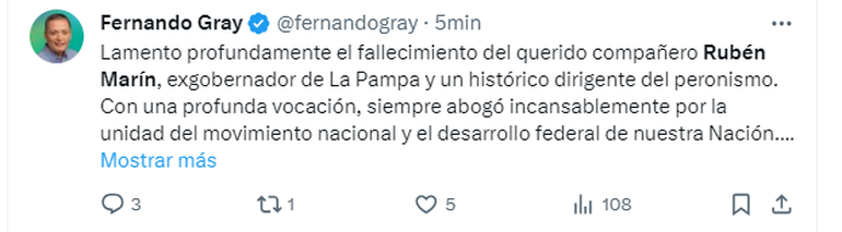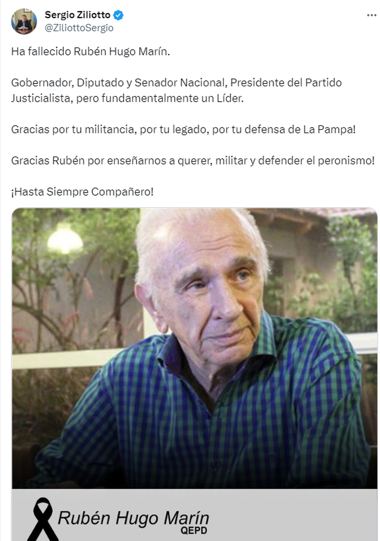 "Ha fallecido Rubén Hugo Marín. Gobernador, diputado y senador Nacional, presidente del Partido Justicialista, pero fundamentalmente un Líder", expresó Ziliotto desde su cuenta personal de X.
