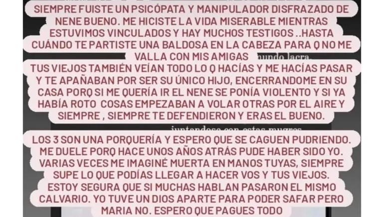 Por otro lado, señaló que los padres de Chiminelli son cómplices de los comportamientos abusivos que tenía el joven detenido. "Tus viejos también veían todo lo que hacías y me hacías pasar y te apañaban por ser su único hijo, encerrándome en su casa porque si me quería ir el nene se ponía violento y si ya había roto cosas empezaban a volar otras por el aire y siempre, siempre te defendieron y eras el bueno", relató.