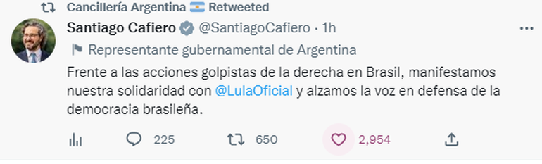 “Frente a las acciones golpistas de la derecha en Brasil, manifestamos nuestra solidaridad con Lula da Silva y alzamos la voz en defensa de la democracia brasileña”, publicó Cafiero en su cuenta Twitter.