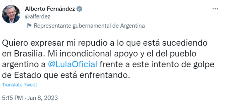 En ese sentido, añadió: “Quiero expresar mi repudio a lo que está sucediendo en Brasilia. Mi incondicional apoyo y el del pueblo argentino a Lula da Silva frente a este intento de golpe de Estado que está enfrentando”.