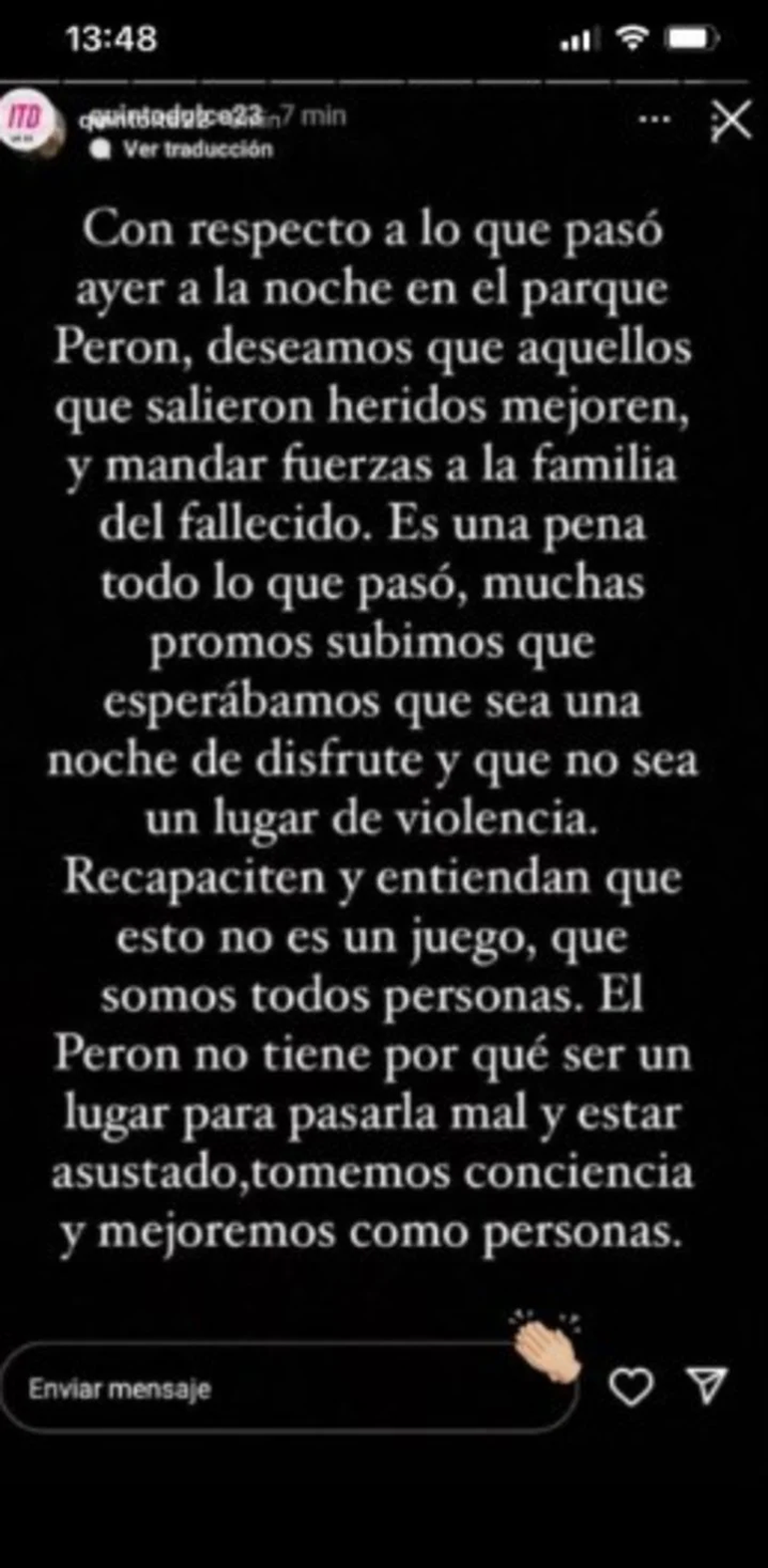 Es que tanto por Instagram como por Twitter circularon capturas de mensajes de WhatsApp en los cuales se habla de 15 heridos y al menos un muerto. "Con respecto a lo que pasó ayer a la noche en el parque Perón, deseamos que aquellos que salieron heridos mejoren, y mandar fuerzas a la familia del fallecido. Es una pena todo lo que pasó", se publicó en historias de Instagram de distintas cuentas de estudiantes de quinto año.