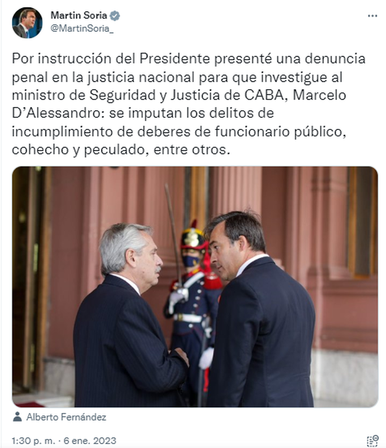 "Por instrucción del Presidente presenté una denuncia penal en la justicia nacional para que investigue al ministro de Seguridad y Justicia de CABA, Marcelo D'Alessandro: se imputan los delitos de incumplimiento de deberes de funcionario público, cohecho y peculado, entre otros", indicó el Ministro en su cuenta de Twitter, acompañado de un comunicado del Ministerio de Justicia.