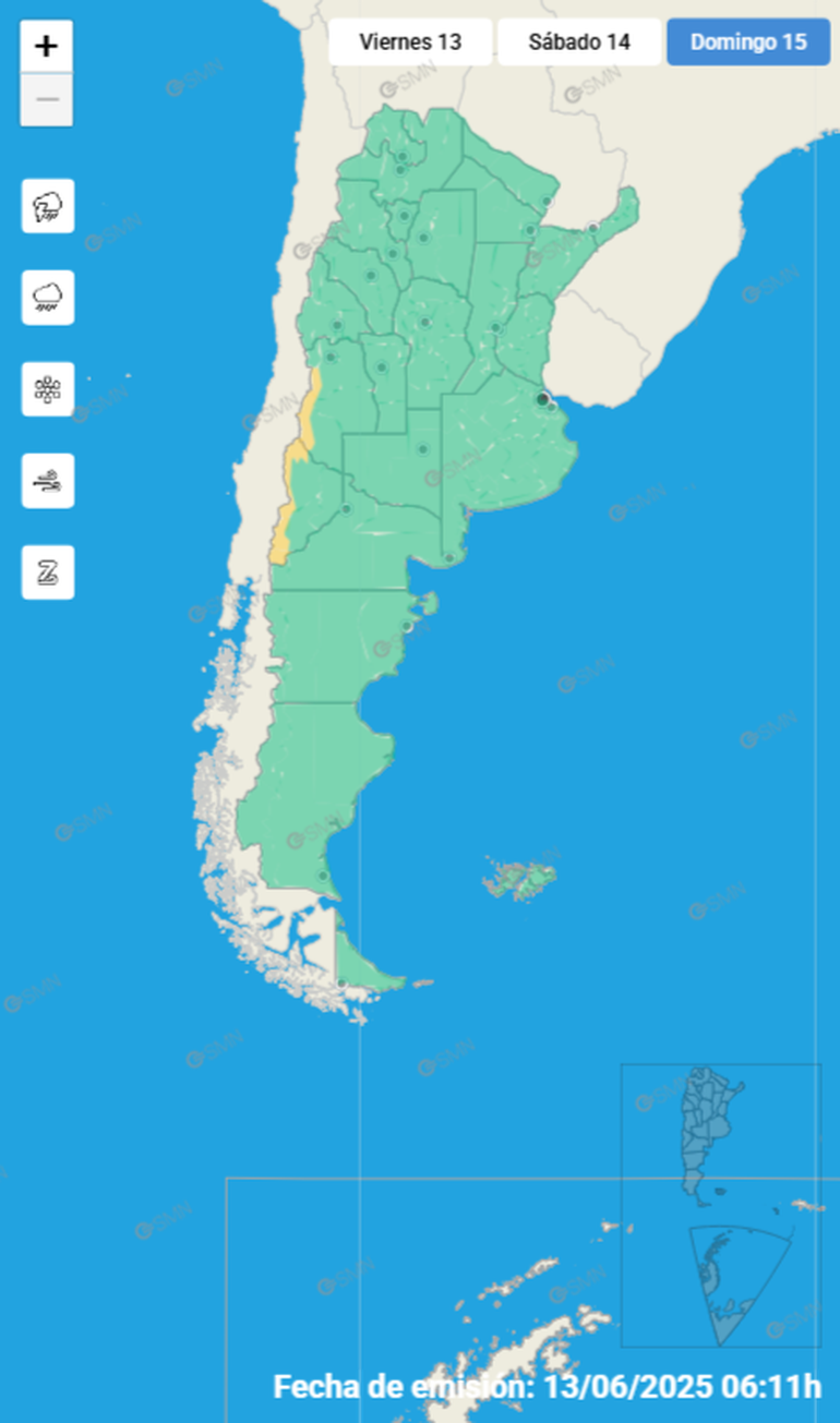 Por último, el SMN indicó que hasta el momento se encuentra vigente una alerta amarillas por intensas nevadas y vientos, que se darán en la zona de la cordillera, principalmente de la Patagonia el día domingo 16 de junio.