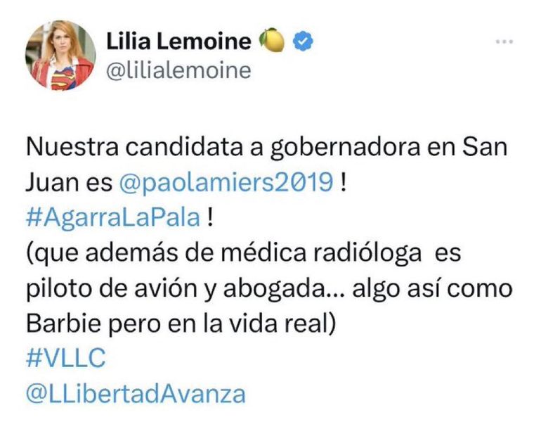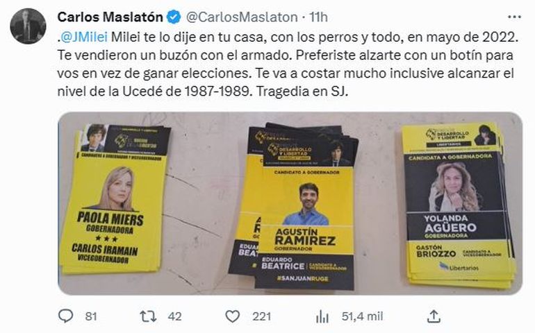 “La Libertad Avanza aclara que no participa en forma oficial de las elecciones en la provincia de San Juan del próximo domingo, ni le brinda el respaldo a ningún candidato”, expresaron en redes sociales. Pero fue el mediático Carlos Maslatón quien les llevó la contra, porque reflejó una foto del equipo entero de LLA, donde se puede observar a Paola Miers. Y no solo eso: también tweets de referentes del espacio político apuntalándola como "la" candidata.