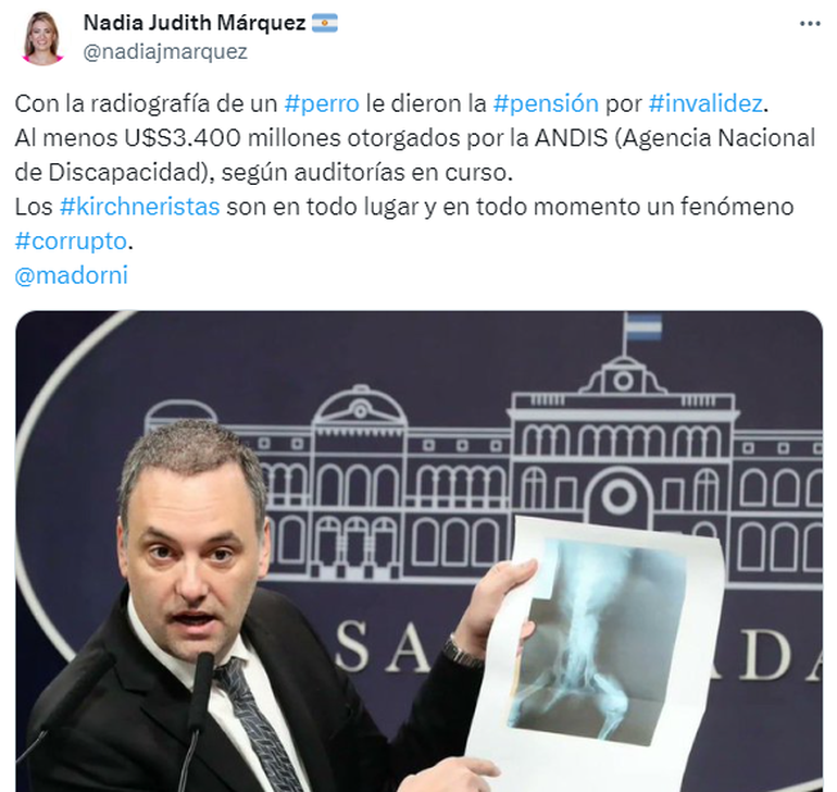 También hizo público el caso de la provincia de Chaco, donde una misma radiografía de hombro fue presentada como prueba en 150 pensiones por invalidez, mientras que en 2022 “un médico correntino de dudosa ética profesional adjuntó al certificado que presentó para la obtención de una pensión la radiografía de un perro”, material cuya copia el vocero compartió entre los periodistas presentes en la conferencia, ya que en la imagen se puede ver la cola del perro.