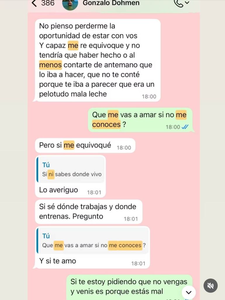 “Me decía ‘te amo’ sin conocerme, me decía que quería todo conmigo”, escribió. También afirmó que él le hacía saber que conocía sus rutinas: “Me decía que sabía dónde entrenaba, dónde trabajaba, a qué hora entraba y salía”.