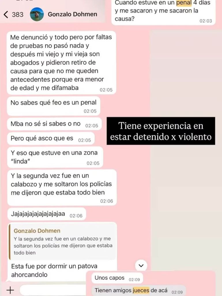 En esa publicación difundió fotos de presuntos moretones en una mano y un brazo, además de capturas de conversaciones privadas donde él reconoció haber estado preso antes y que, por sus vínculos, las causas quedaban en la nada.