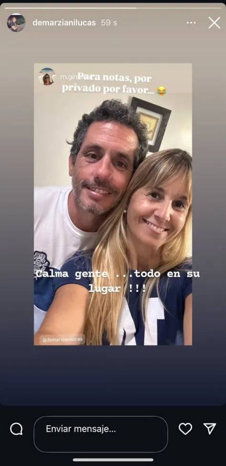 Horas más tarde, cuando el video ya circulaba por las redes, la pareja compartió una foto aclarando que la situación quedó en la cancha y que se encontraban en orden. “Calma gente… Todo en su lugar”, publicaron los aficionados, junto a una imagen de ambos con una gran sonrisa.