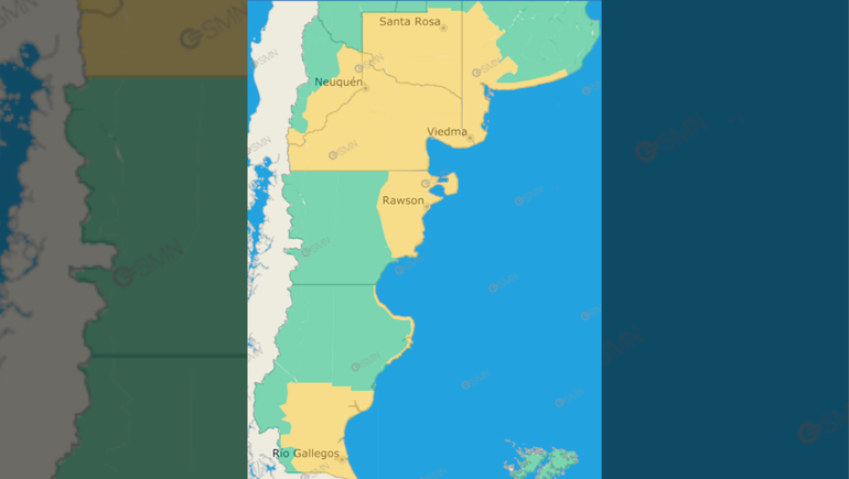 En la zona atlántica de Chubut, la costa de Santa Cruz y la zona sur de la misma provincia, los valores serán similares: “el área será afectada por vientos del sector sur con velocidades entre 30 y 45 km/h, y ráfagas que pueden alcanzar los 80 km/h”, se expresó desde el organismo.
