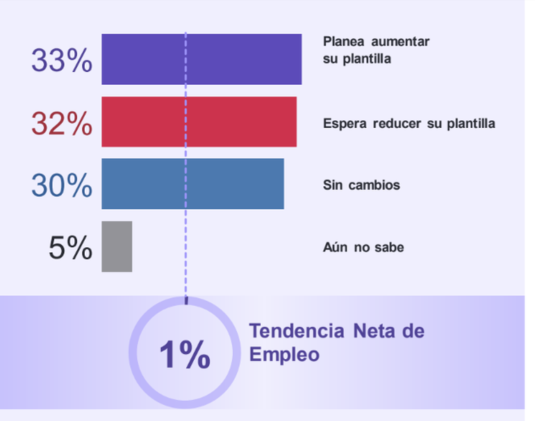 “Los resultados revelan que el 33% de los empleadores encuestados planea aumentar sus dotaciones de personal, el 32% disminuirlas, el 30% no espera realizar cambios y el 5% restante no sabe si los realizará durante el periodo relevado”, señala el estudio.