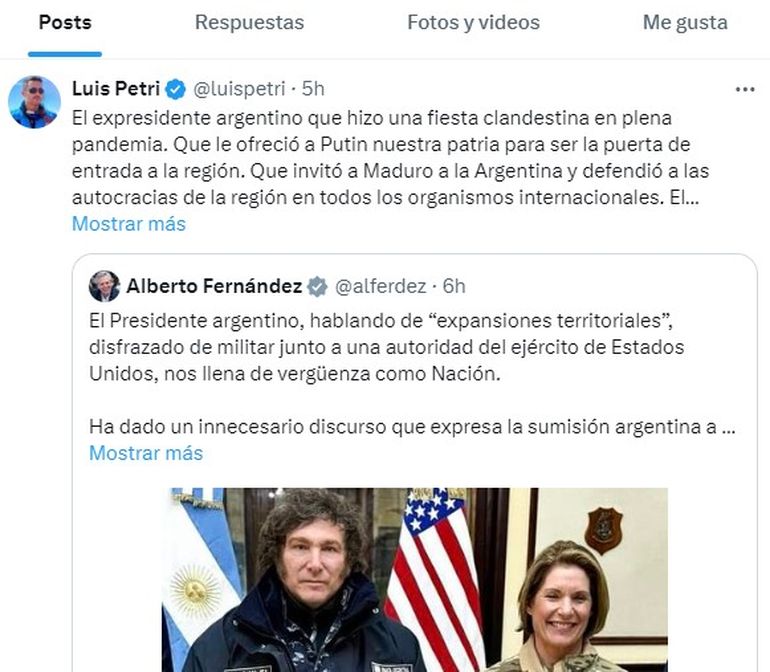 Una de las más resonantes fue la que surgió entre el expresidente Alberto Fernández y el ministro de Defensa, Luis Petri. Todo a través de las redes sociales. El exmandatario dijo que el encuentro entre las autoridades argentinas y la enviada del Gobierno norteamericano fue de un “servilismo humillante".