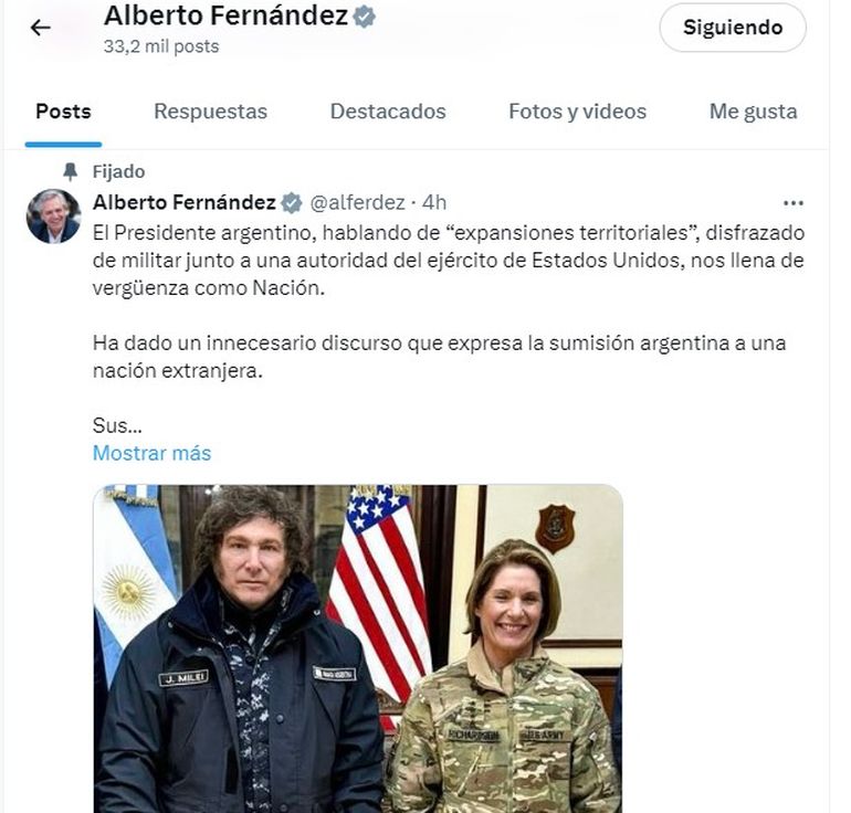 Fernández había manifestado su indignación a través de un posteo con la foto de Milei y Richardson en la misma red social. “El Presidente argentino, hablando de ´expansiones territoriales´, disfrazado de militar junto a una autoridad del ejército de Estados Unidos, nos llena de vergüenza como Nación. Ha dado un innecesario discurso que expresa la sumisión argentina a una nación extranjera”, escribió el saliente mandatario.