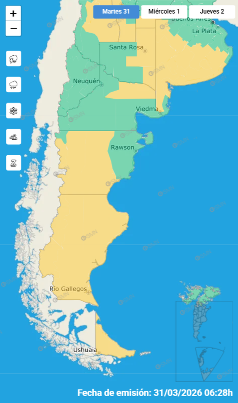 La alerta afectará a las provincias de Chubut, Santa Cruz y Tierra del Fuego durante este martes.
