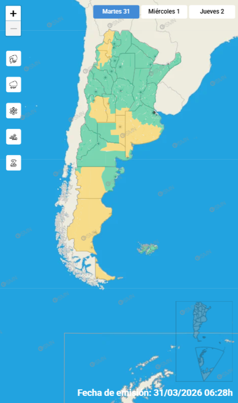 El Servicio Meteorológico Nacional (SMN) emitió una serie de alertas amarilla por tormentas, lluvias y fuertes vientos que afectarán a varias provincias este martes 31 de marzo.