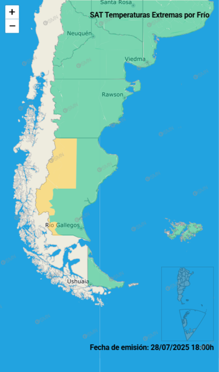 También para este martes se emitió una alerta amarilla por bajas temperaturas en Santa Cruz. El oeste de la provincia será afectado por temperaturas frías extremas.
