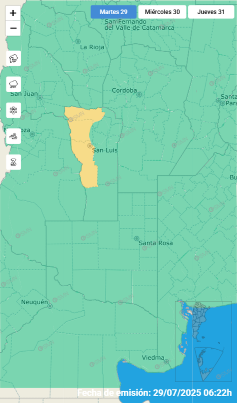 Por otro lado, el SMN emitió otra alerta de nivel amarillo por la presencia de intensos vientos que se extenderán este martes en las provincias de La Rioja, Mendoza, San Luis y San Juan.