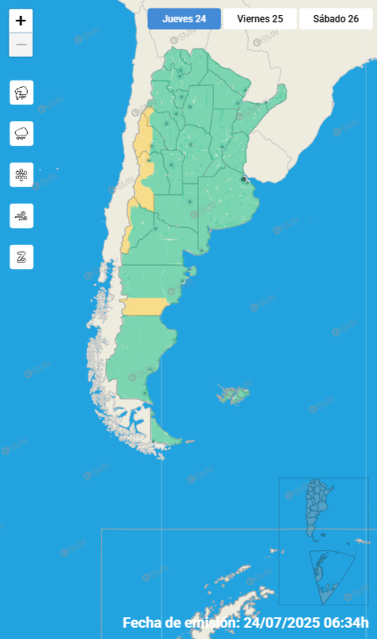El Servicio Meteorológico Nacional (SMN) emitió una serie de alertas amarillas por vientos fuertes, nevadas y frío extremo que rigen este jueves 24 de julio en varias provincias argentinas.