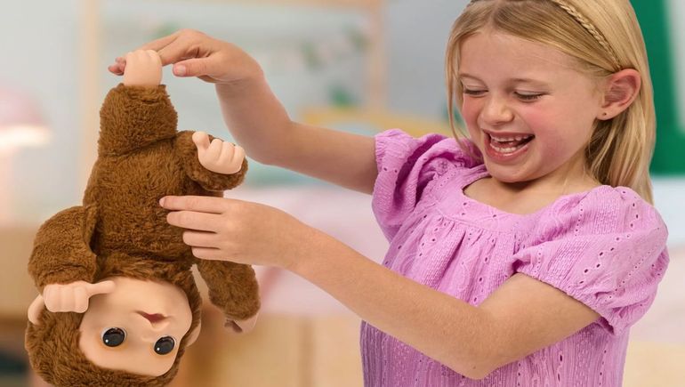 El muñeco tiene un diseño amable, con pelaje suave, orejas grandes y detalles que le dan un aspecto expresivo. Incluye un biberón, un certificado de adopción y un folleto de instrucciones, elementos que refuerzan el juego simbólico. Cuando se le acaricia el estómago, el mono se ríe. Cuando se lo acuesta, reproduce una nana. Si se lo deja dormir colgado boca abajo, reacciona como un animal real. Está disponible a 42.802 pesos argentinos.