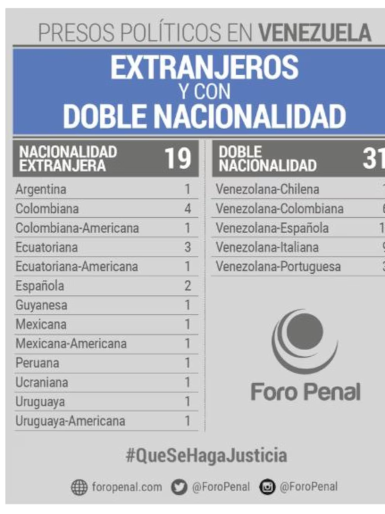 Una novedad que ocurrió en las últimas horas es que el Foro Penal -que se ocupa de hacer el seguimiento de las violaciones a los derechos humanos en Venezuela- actualizó su base de datos de presos políticos en ese país e incluyó el caso del gendarme argentino. “Balance de Presos Políticos en Venezuela extranjeros o con doble nacionalidad, lista por nacionalidad. 19 extranjeros, 31 con doble nacionalidad”, informó.